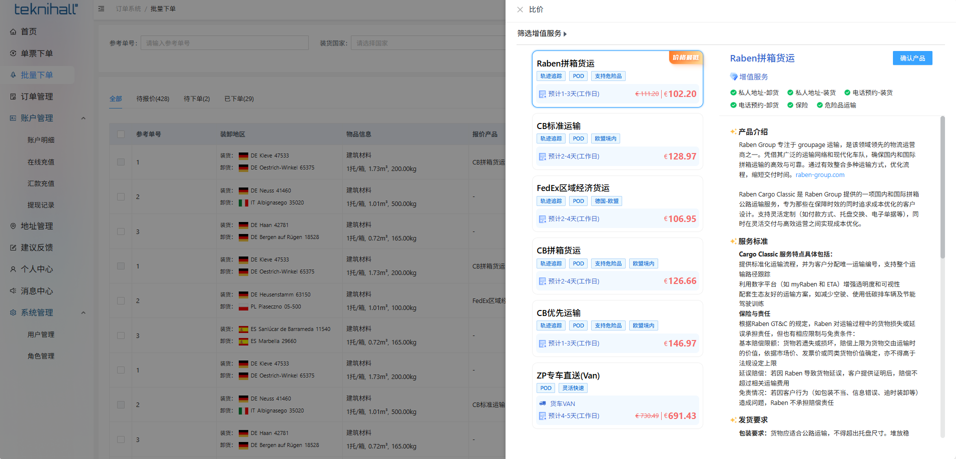 “批量下单”模块用于批量创建多个运输任务, 用户可根据时效、价格与固定产品快速选择询价方案并在线下单。