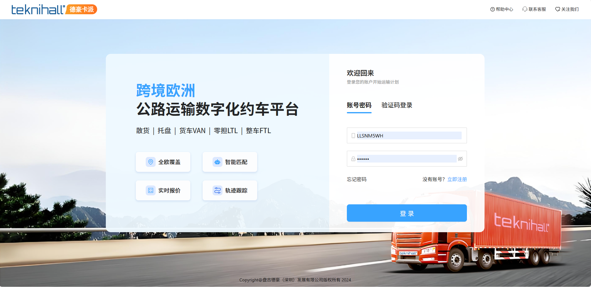 此页面用于用户注册与登录德豪卡派跨境欧洲公路运输数字化约车平台,通过系统完成订单创建、价格查询、车辆调度与轨迹跟踪等业务操作。 适用于:货代公司、电商仓储企业、跨境卖家及欧洲本地发货商。